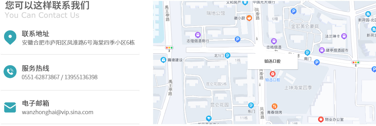 地址:安徽合肥廬陽(yáng)區(qū)鳳淮路6號(hào),海棠四季小區(qū)6棟,鉑迅口腔門(mén)診部 門(mén)診部聯(lián)系電話(huà):0551-62873867/13955136398