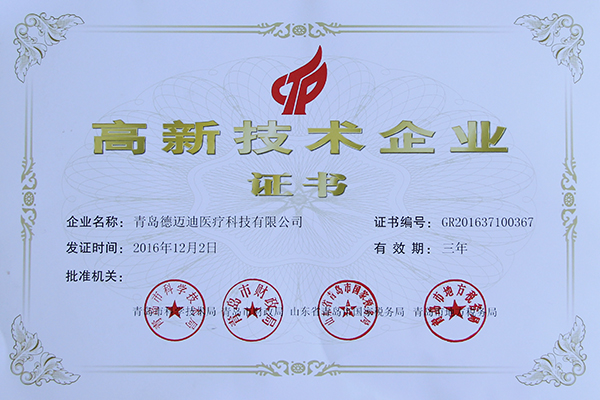 青島德邁迪醫(yī)療科技有限公司獲得青島市科學技術(shù)局&青島市財政局&山東省青島市國家稅務局&青島市地方稅務局高新技術(shù)企業(yè)證書;